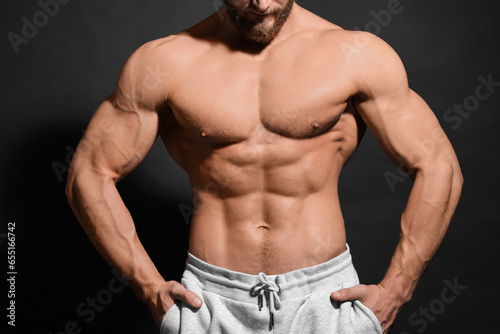 Fototapeta premium Muscular man showing abs on black background, closeup. Sexy body