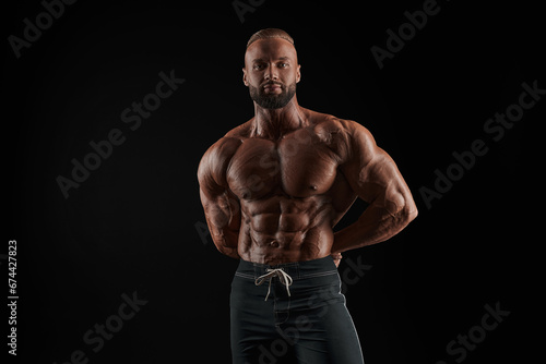 Fototapeta premium Muscular man shows his muscles against the background of a black wall. Bodybuilder, male naked torso, abs.