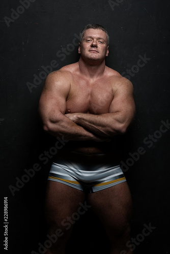 © Vladimir, Fototapeta premium muscular man shows off his body near black grunge wall