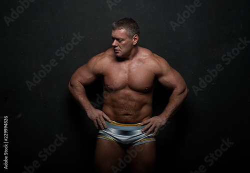 © Vladimir, Fototapeta premium muscular man shows off his body near black grunge wall