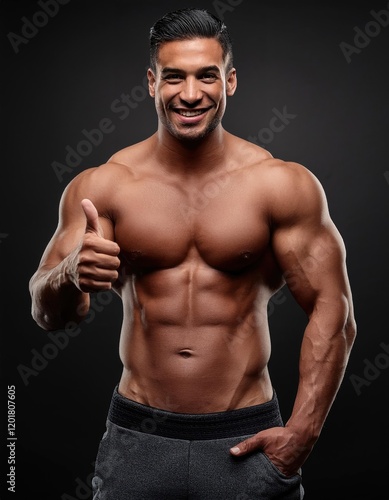 © Marko, Fototapeta premium Muscular Man Shows Thumbs Up Smiling Against Dark Background