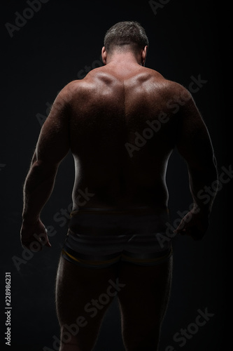 © Vladimir, Fototapeta premium Muscular man with a powerful back posing on a black background. concept of sports and fitness