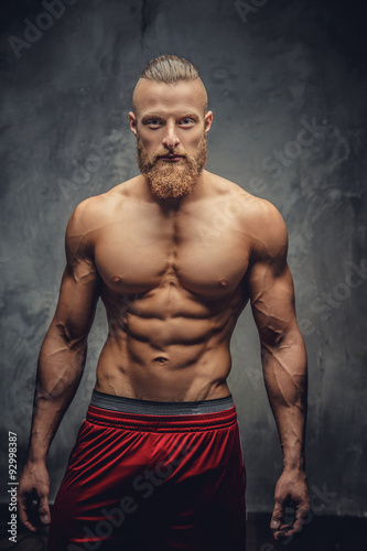 © Fxquadro, Fototapeta premium Muscular man with beard posing over grey background.