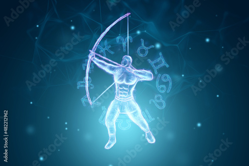 Fototapeta premium Muscular man with bow blue hologram, zodiac sign Sagittarius on the...