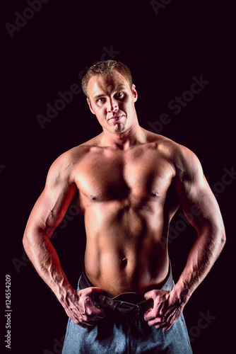 Fototapeta premium Muscular man with dumbbells on black background