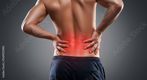 © Firyal Affina, Naklejka premium Muscular Man with Lower Back Pain, Red Highlight on Injury
