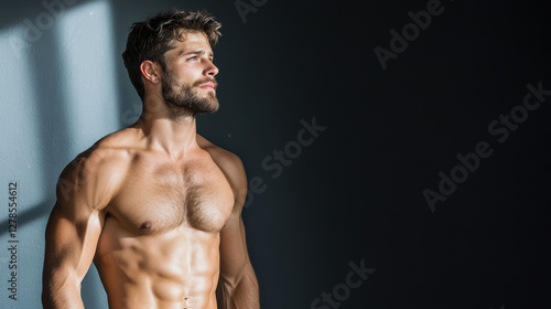 Fototapeta premium Muscular man with six pack abs in low light, showcasing strength and confidence