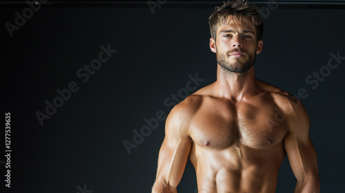 Fototapeta premium Muscular man with six pack abs posing in low light, showcasing strength and confidence