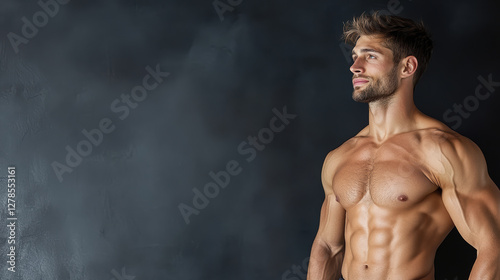 © siraphol, Obraz premium muscular man with well defined six pack poses confidently against dark background