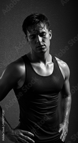 © JOKI, Fototapeta premium Muscular man with wet skin in a black tank top