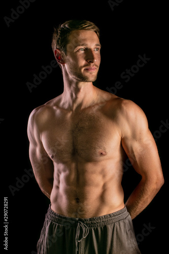 © Evgeniy, Fototapeta premium Muscular model young man on isolated black background. Sport workout bodybuilding concept. Strong bodybuilder fitness guy posing and demonstrating abdominal muscles abs and core.