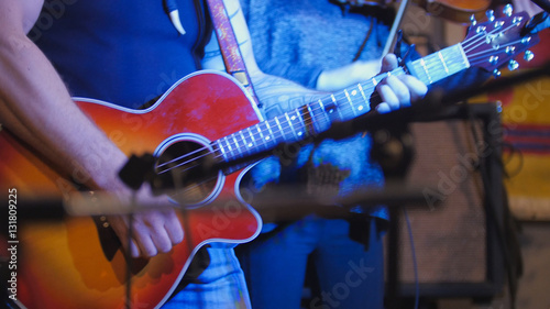 Naklejka premium Muscular musician - guitarists - plays concert acoustic guitar in night club