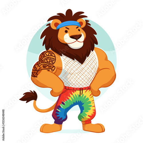 © InspirationDesign, Obraz premium Muscular tattooed lion in mesh tank top and rainbow pants. Perfect for pride events or gym fitness motivation campaigns.