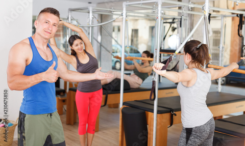 © JENOCHE, Obraz premium muscular trainer with a group of girls in the modern gym doing exercises