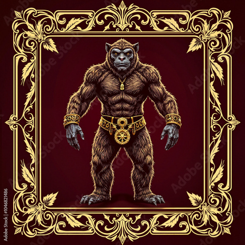 © Krasavina Alena, Fototapeta premium Muscular werewolf in decorative frame on maroon background