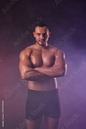 Fototapeta premium Muscular young bodybuilder in colorful smoke