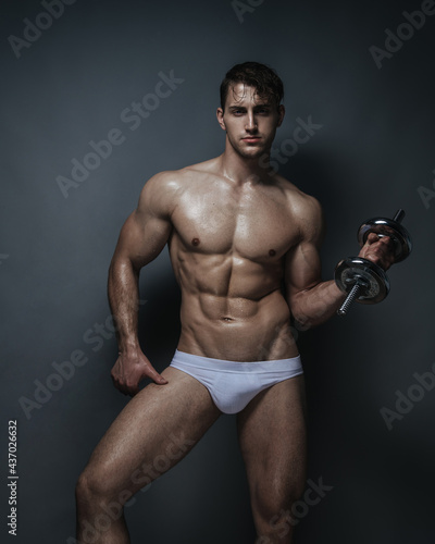 © Serge Lee, Fototapeta premium Muscular young man in white underwear with dumbbell in studio at grey background