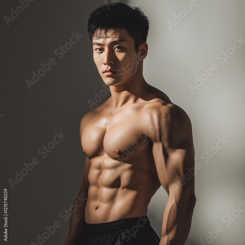 © Brastock Images, Fototapeta premium Muscular Young Man Posing Shirtless Displaying Defined Abs and Athletic Fitness