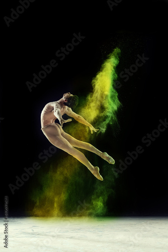 Obraz premium Muscular young man, professional ballet dancer in motion, dancing with colorful powder explosion against black studio background. Concept of art, festival, beauty of dance, inspiration, youth