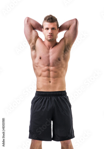 © theartofphoto, Fototapeta premium Muscular young man with arms up, isolated on white background