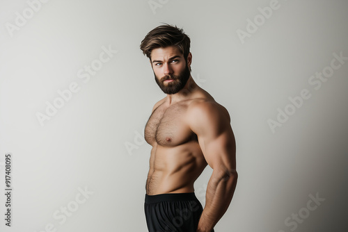 © Serge's AI Art, Fototapeta premium Muscular Young Man with Beard and Styled Hair in Black Shorts, Studio Side Profile