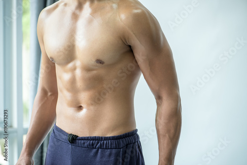 © kavee29, Fototapeta premium muscular young man with dumbbell healthy concept