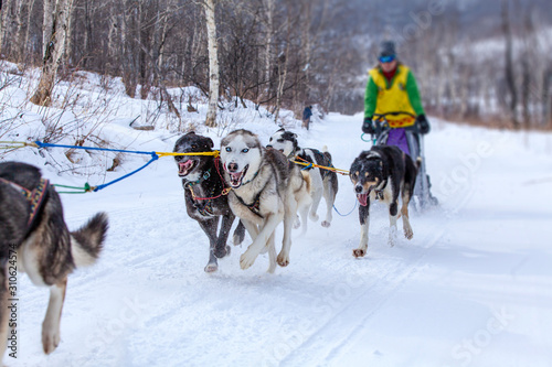 © bborriss, Naklejka premium musher hiding behind sleigh at sled dog race on snow in winter