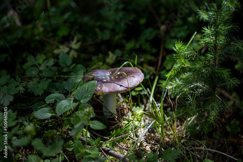 Obraz premium Mushroom in the mountain forest on a summer day. Close up macro view.