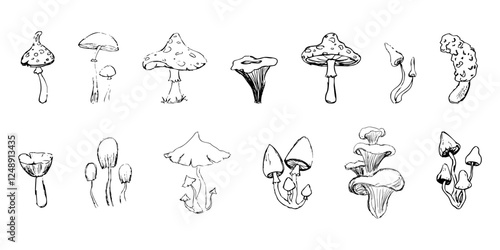 © Alyona, Naklejka premium Mushroom sketch doodle drawing, fantasy forest line plant. Set botanical hand drawn mushrooms. Tattoo sign Linear.