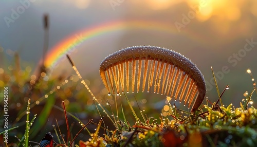 © gilz_r, Fototapeta premium Mushroom with Rainbow and Dewdrops in a Sunny Morning Meadow.