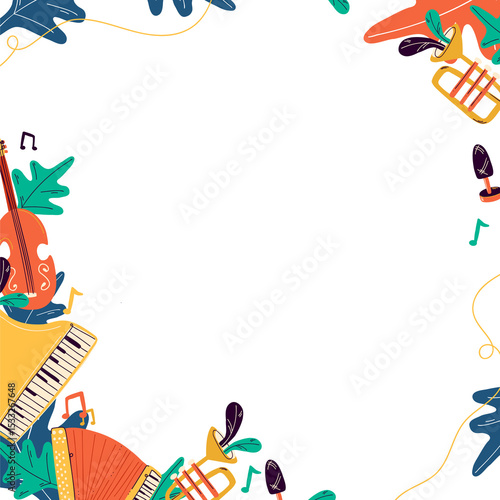 Naklejka premium Music frame is showing trumpets, keys, violin and notes around center on...
