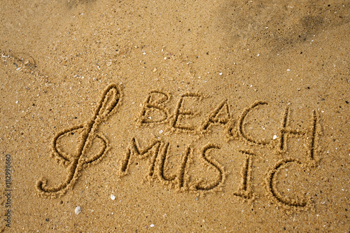 Fototapeta premium Music key and text beach music drawn on a yellow sand.