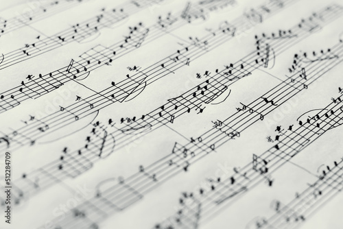 Obraz premium Music notes macro background, handwritten notes, selective focus