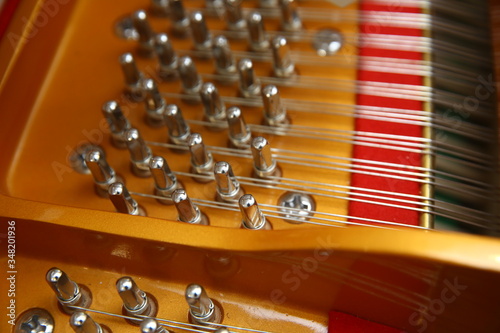 © Adil, Naklejka premium Music playing from the ancient ruined piano . Hammers in abandoned piano striking strings tuned to produce the note when a piano key is pressed.