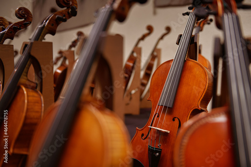 Fototapeta premium Music sound industry. Close up view with a lot of violins made of wood.