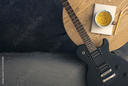 Obraz premium Musical background with electric guitar, notepad and cup of tea on the table.