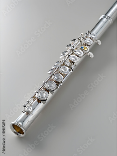 © Fillipe, Fototapeta premium Musical Instrument Elegance: A detailed, studio shot of a gleaming silver flute, its keys reflecting light with precision. The image embodies a serene, classical music experience.