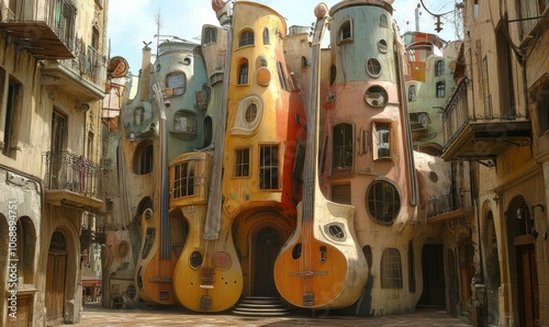 © jambulart, Naklejka premium Musical instrument shaped building facades.