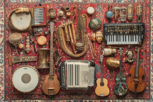 © jambulart, Fototapeta premium Musical instruments and percussion laid on a rug.