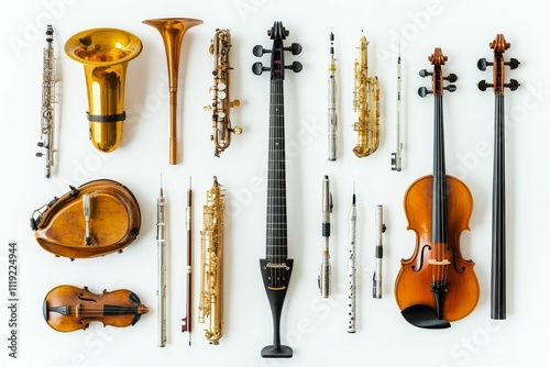 © ATH'HAR Art Ai, Naklejka premium Musical instruments arranged on white background.