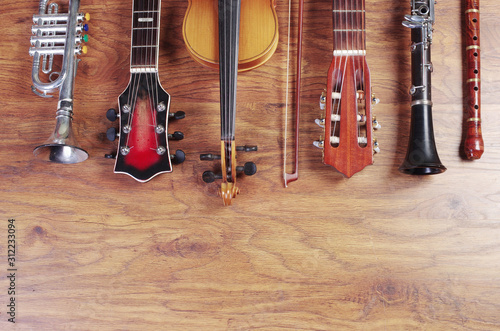 © yrafoto, Naklejka premium Musical instruments on a wooden textured background. Block flute, violin, guitar, electric guitar, trumpet