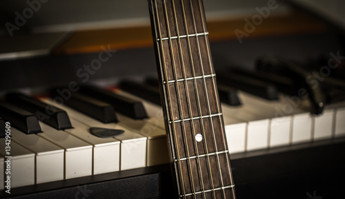 Fototapeta premium musical instruments piano keys and acoustic guitar