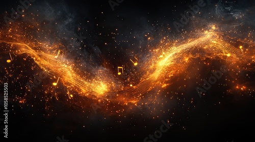 Fototapeta premium Musical wave design with glowing white notes on black background, featuring gold and amber tones