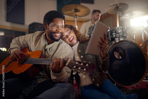 Fototapeta premium Musician, guitar and couple with a tablet for music, email and learning sound...
