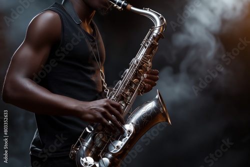 © gearstd, Fototapeta premium Musician immersed in playing a saxophone