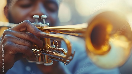 © Muhas, Obraz premium Musician playing a trumpet outdoors during golden hour, with a soft bokeh background