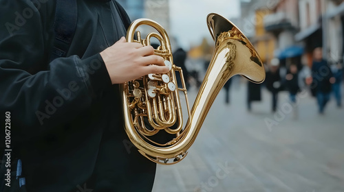Fototapeta premium Musician playing horn in city street, blurred crowd background; stock photo...