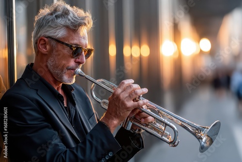 © YouraPechkin, Obraz premium Musician plays trumpet during sunset in urban setting with soft warm light