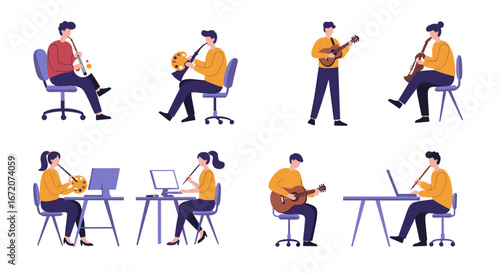 Naklejka premium Musicians practicing instruments in office setting with diverse styles