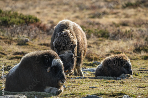 © Fridimedia, Fototapeta premium musk ox in norway in dovrefjell relaxing in autumn